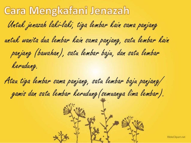 Kain kafan dipotong menjadi 3 bahagian. 72 Cara-cara mengkafankan jenazah 80 Sembahyang jenazah 81 Syarat bagi jenazah yang hendak disembahyangkan 82 Rukun sembahyang jenazah 83 Cara menyembahyangkan jenazah 84 Perkara-perkara sunat bagi sembahyang jenazah 85 Imam solat jenazah 90 Mengebumikan jenazah. Tata cara mengafani jenazah perempuan.
